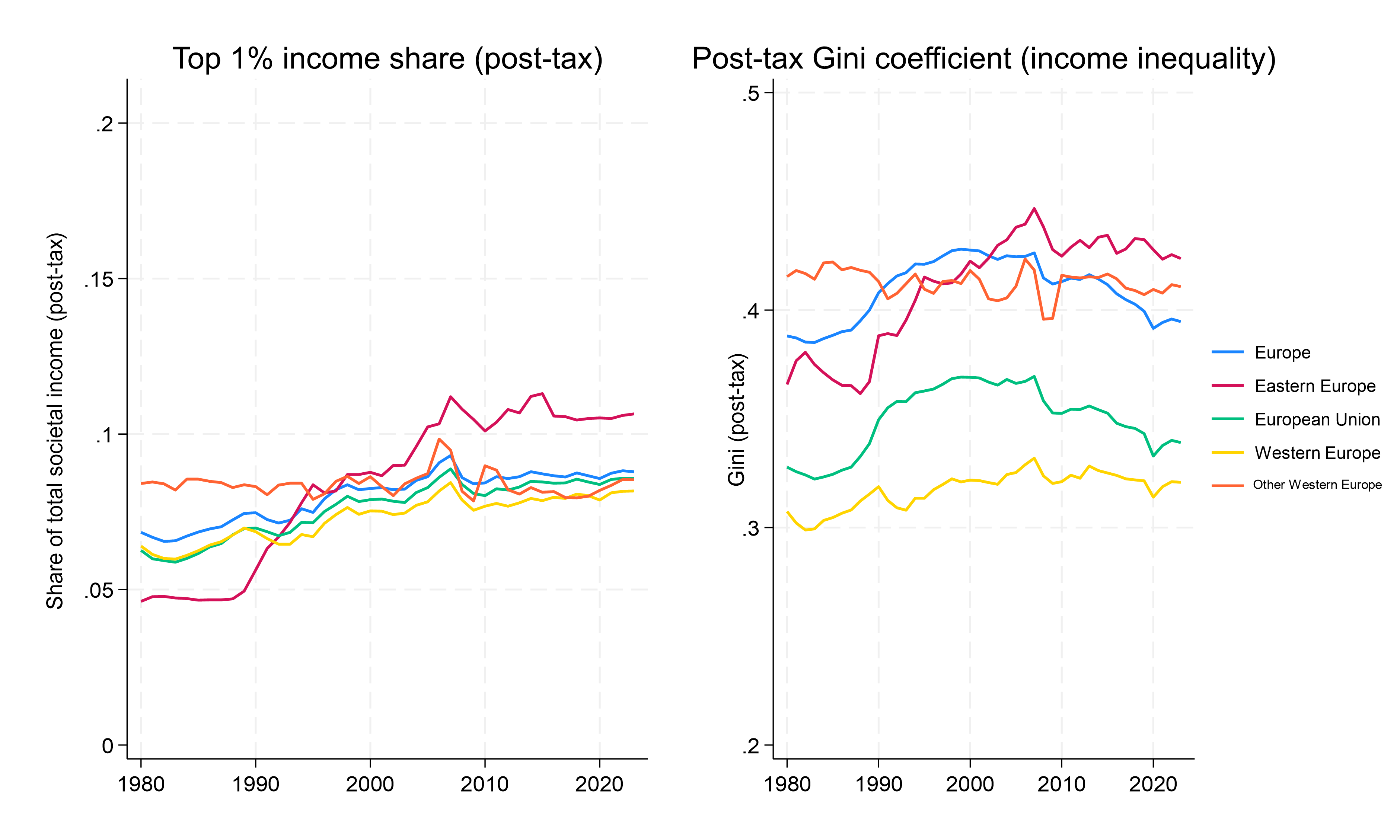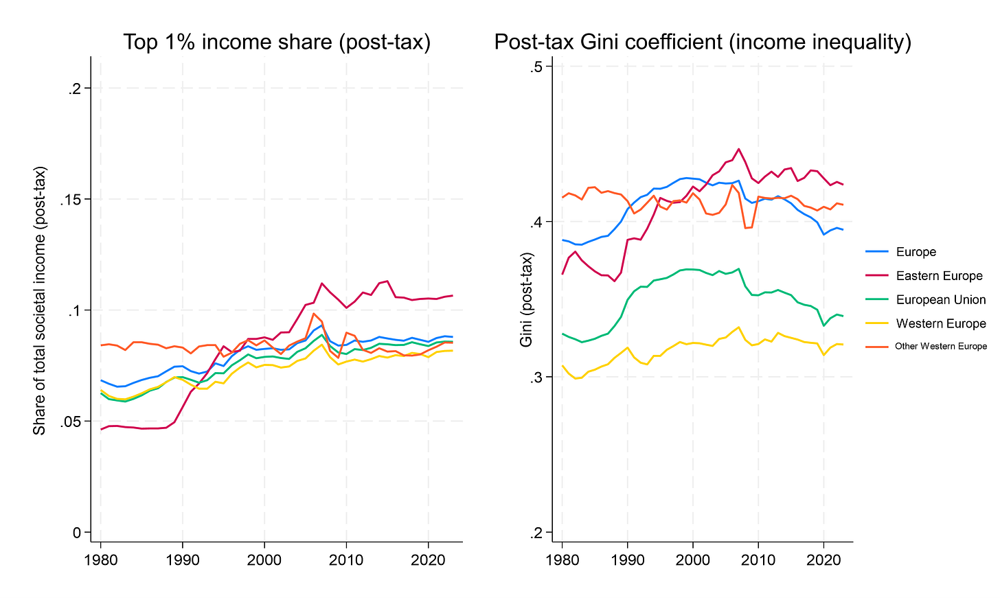 Let’s zoom in further on Europe to get a better look. Again, no increase over the past two decades, with the Gini even decreasing.
