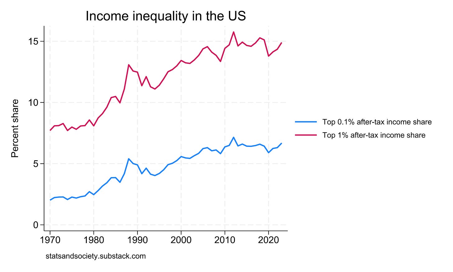 As you can see, this is true whether we look at income inequality expressed through the Gini coefficient or as measured by the income share of the top 1% or 0.1%.1