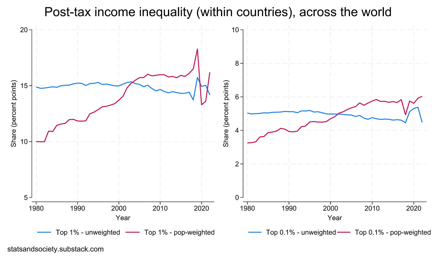 Finally, if we weight by population, we see that wealth inequality has been increasing throughout. That is to say, if we’re mostly interested in what people in the US, China, and India – three countries that represent almost half the world population – are experiencing, the answer is: “Rising inequality.” So, on the one hand, wealth concentration is not increasing in the typical country, but on the other hand, the typical person does see it rise on account of what’s been happening to the three most populated societies on the planet, where almost half of humanity lives.
