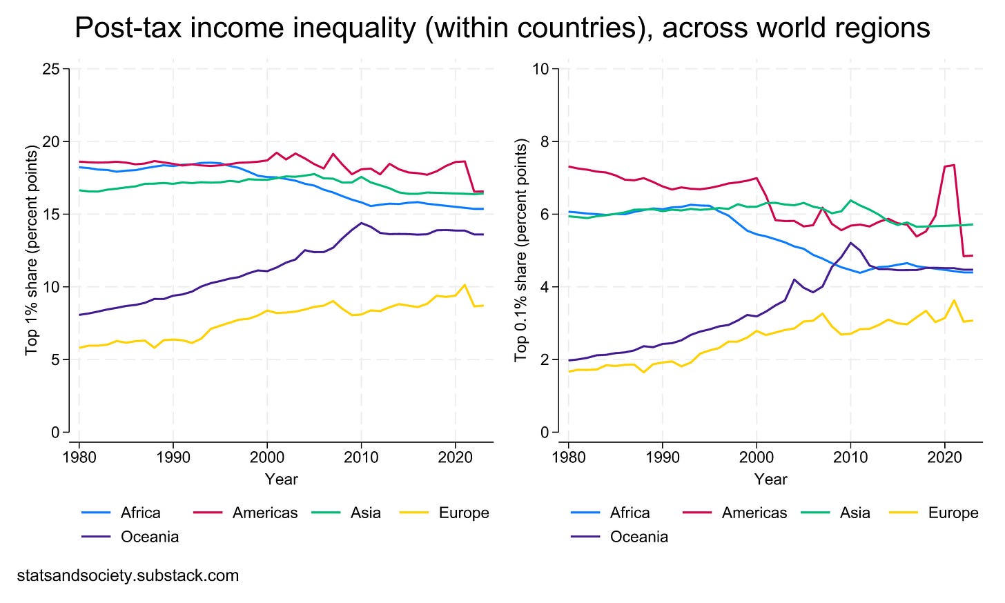 Okay, but what if we zoom in and take a regional-average perspective? That is, what does income inequality within countries look like if we aggregate it at the level of specific world regions? No increase since 1980 in the typical country in the Americas, Asia (China is an exception), or Africa. A big increase in Oceania, but just until 2010. And a slower rise in Europe, but mostly stagnation over the past two decades.