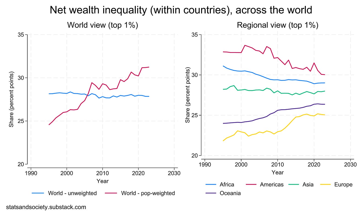 The world average (measured within each individual country) can also be decomposed into regional averages. These are more heterogeneous. Countries in the Americas (though not the US) have seen a clear decrease in wealth inequality. The same goes for Africa. In Asia, nothing much has changed through the decades (though again China is an important exception). In Oceania, the top 1% is capturing more and more total wealth. In Europe, something similar was happening between the 1990s and mid-2010s; however, for the past decade, wealth inequality has been stagnant in Europe as well.