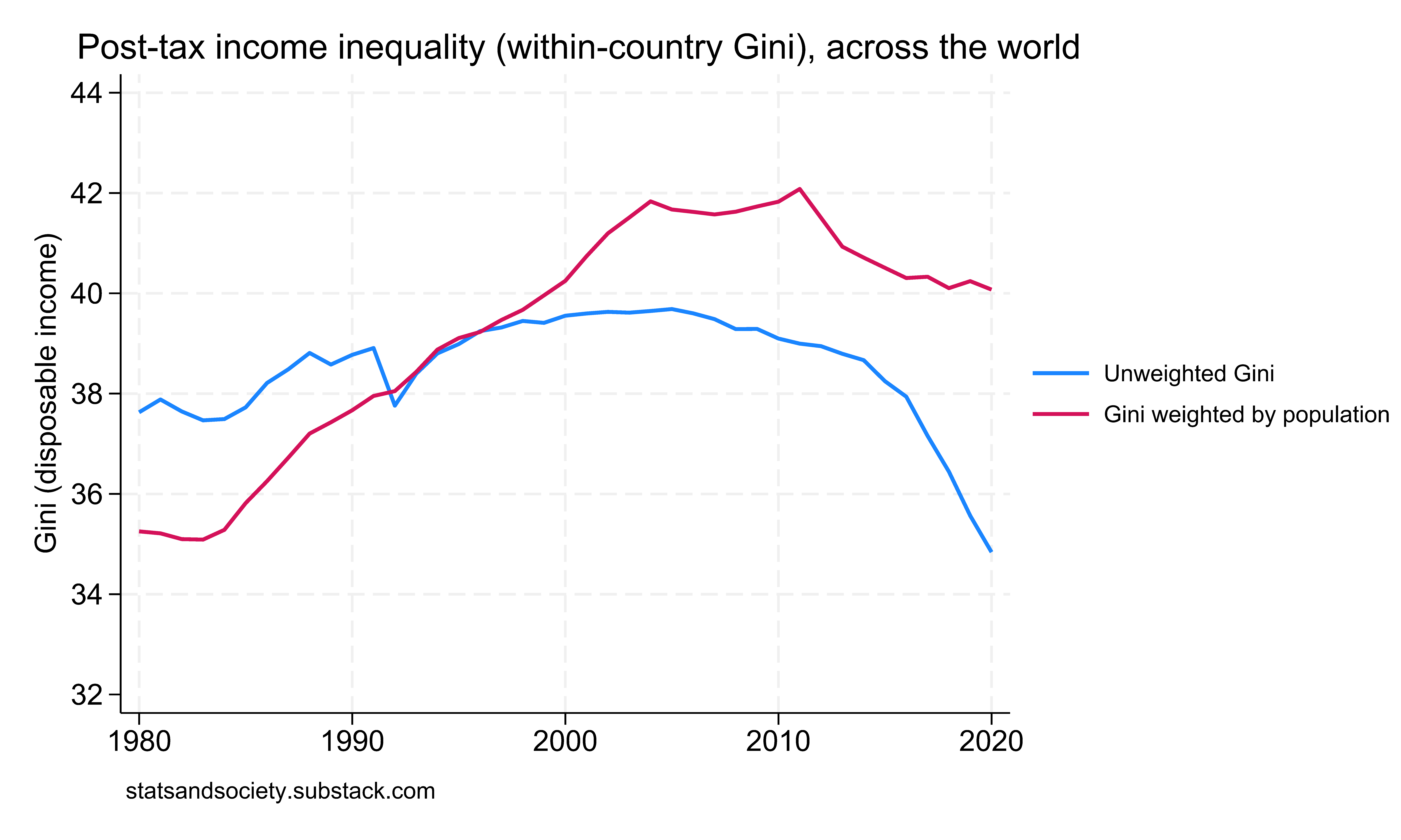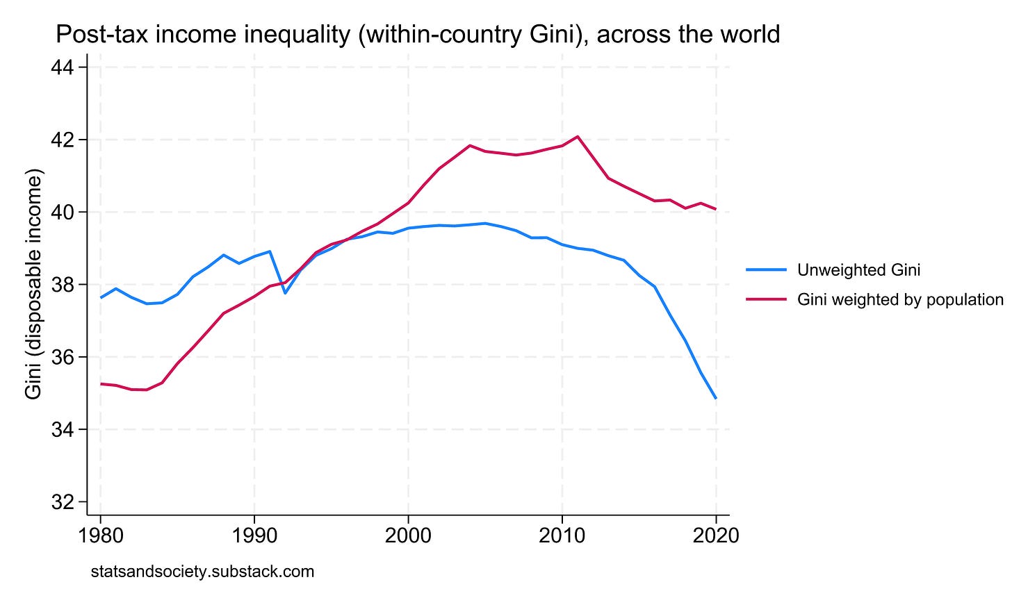We should weight the world average if we’re interested in whether the typical person (instead of the typical country) is burdened by rising inequality. But as is clear, relying either on raw averages, where each country – large or small – contributes equally to the total, or using population-weighted averages in the end doesn’t really change the picture much over the past two decades. Income inequality is not increasing and hasn’t been for quite a while now. That’s good news.