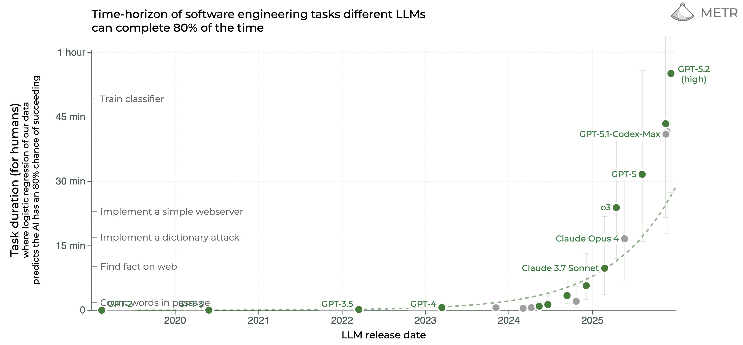 Then there’s the infamous METR graph. A bit over a week ago, the latest evals (GPT 5.2) were added, and it looks like this. Performance is definitely hitting “a wall,” just not the kind of wall you’d think! It’s a vertical wall, not a horizontal ceiling. In other words, “Looks like we're going to need a taller sigmoid...” So, forget about exponential progress slowing down “any day now.”